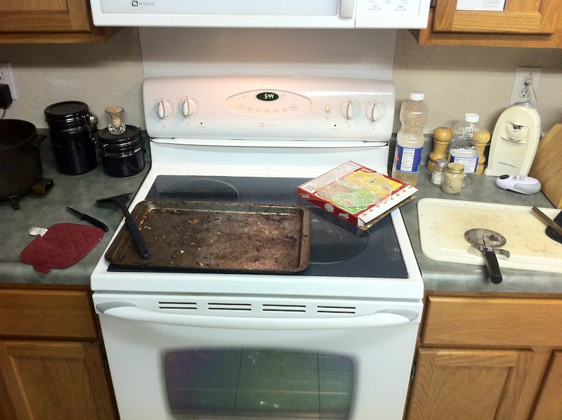 The very next day she had pizza: cutting board, the plastic wrap from the pizza, knife to open the plastic wrap, spatula, potholder, pizza cutter, cookie sheet and the box. Again, trashcan is a measly ~4 feet away. The sink is also a miniscule distance away.
